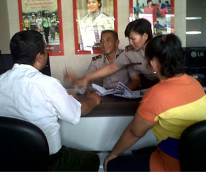 Teks: Korban penipuan investasi melaporkan ke SPKT Polresta Depok diterima oleh Kepala SKPT AKP Ana Rohana. (Angga)