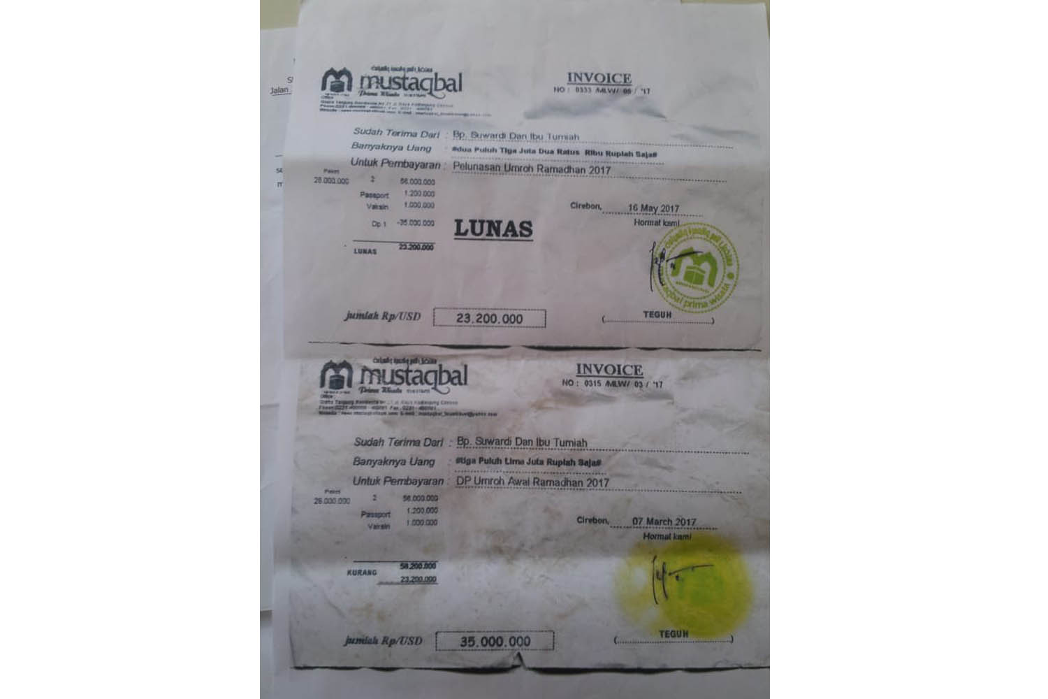 Sementara itu, korban lainnya Suwardi menyebutkan jika ia dan istrinya telah menyetorkan uang sebanyak dua kali untuk perjalanan umrah melalui Mustaqbal. Mereka pun dijanjikan berangkat umrah pada bulan Mei 2017 lalu. Sama seperti Rofahan, janji itu tak juga ditepati.