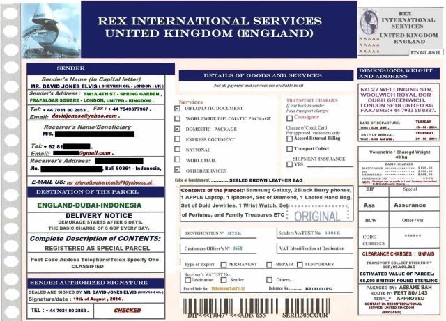 Setelah korespondensi yang berlanjut setelah email ini, saya mendapatkan informasi bahwa berkenalan dengan seseorang di London melewati jejaring sosial (Facebook), dan temannya ini ingin memberikan hadiah yang cukup wah berisi Samsung Galaxy, ponsel BlackBerry, laptop Apple (MacBook), iPhone 4, berlian, tas wanita, parfum, harta keluarga dan semacamnya. Sungguh rejeki besar kalau dilihat – lihat apa pemberian teman baru ini.