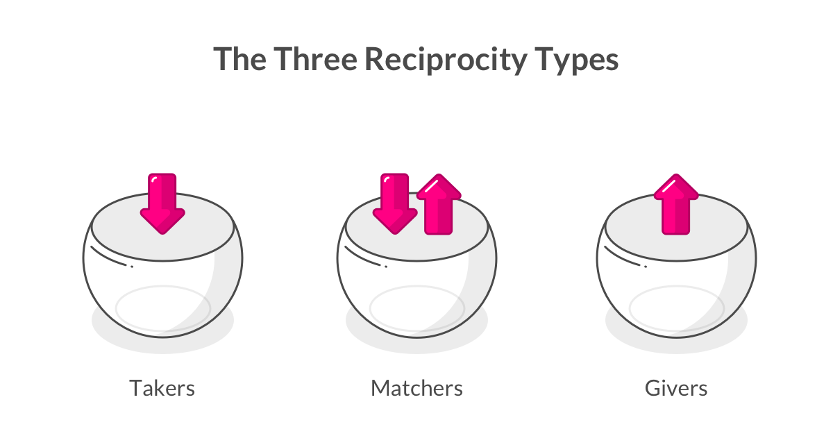 Givers memberi dengan murah hati. Matchers mencari apa yang bisa didapat ketika ia memberi untuk orang lain. Sedangkan takers adalah orang-orang yang mencari keuntungan, dan membantu orang lain hanya bila ia mendapatkan sesuatu yang lebih dari itu.