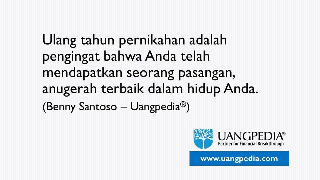 I-Kutipan Ulang tahun pernikahan adalah pengingat bahwa Anda telah mendapatkan seorang pasangan, anugerah terbaik dalam hidup Anda. (Benny Santoso – Uangpedia®) 8 Dec 2020 13:34 646 0 BAGIKAN Facebook Twitter